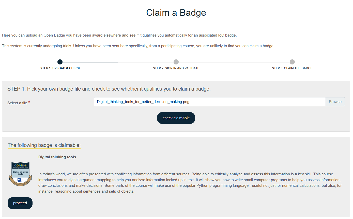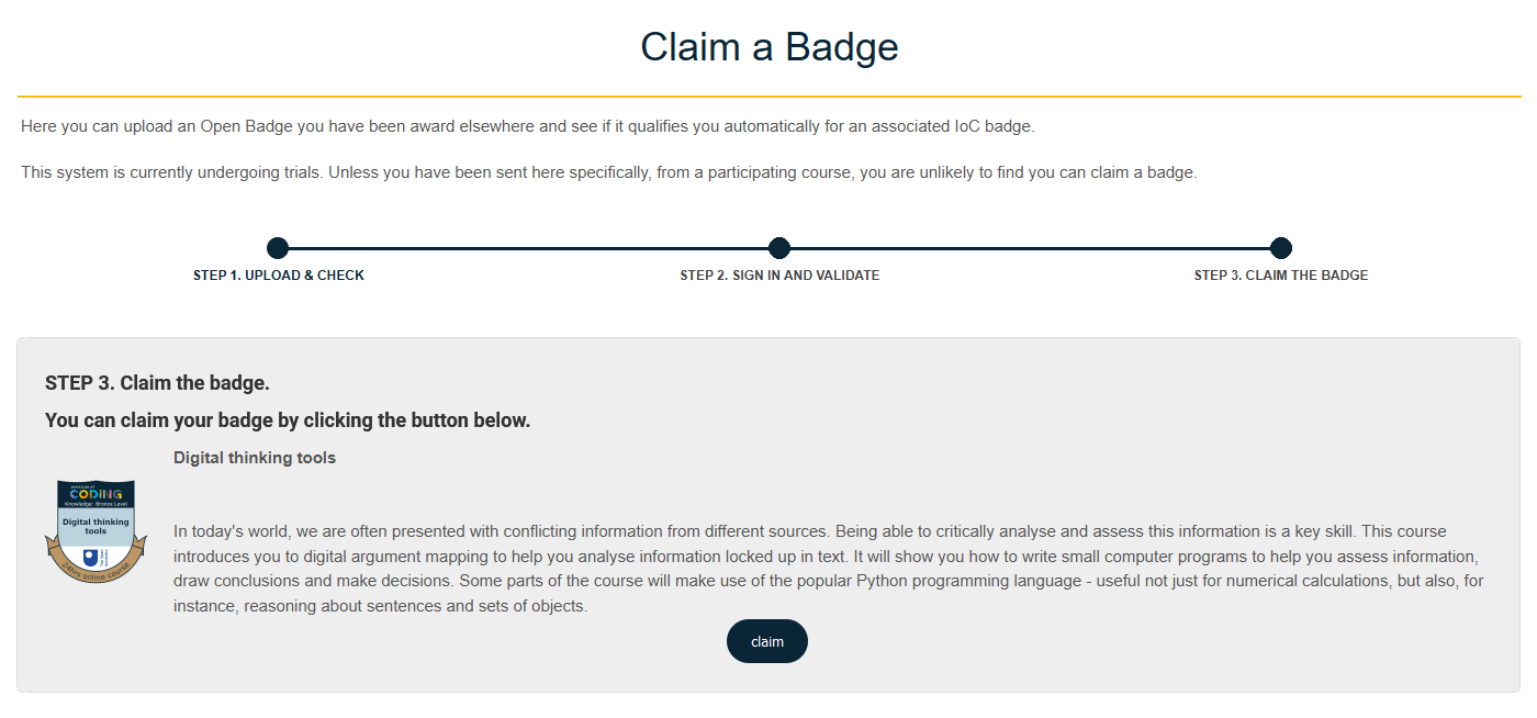 To make a claim for an IoC badge, users had to upload their OpenLearn badge in a special Claims page on the platform. Clicking the “check claimable” button would then check that the external badge uploaded was one that had an associated claimable IoC badge. Strick domain matching and badge content details matching was used.