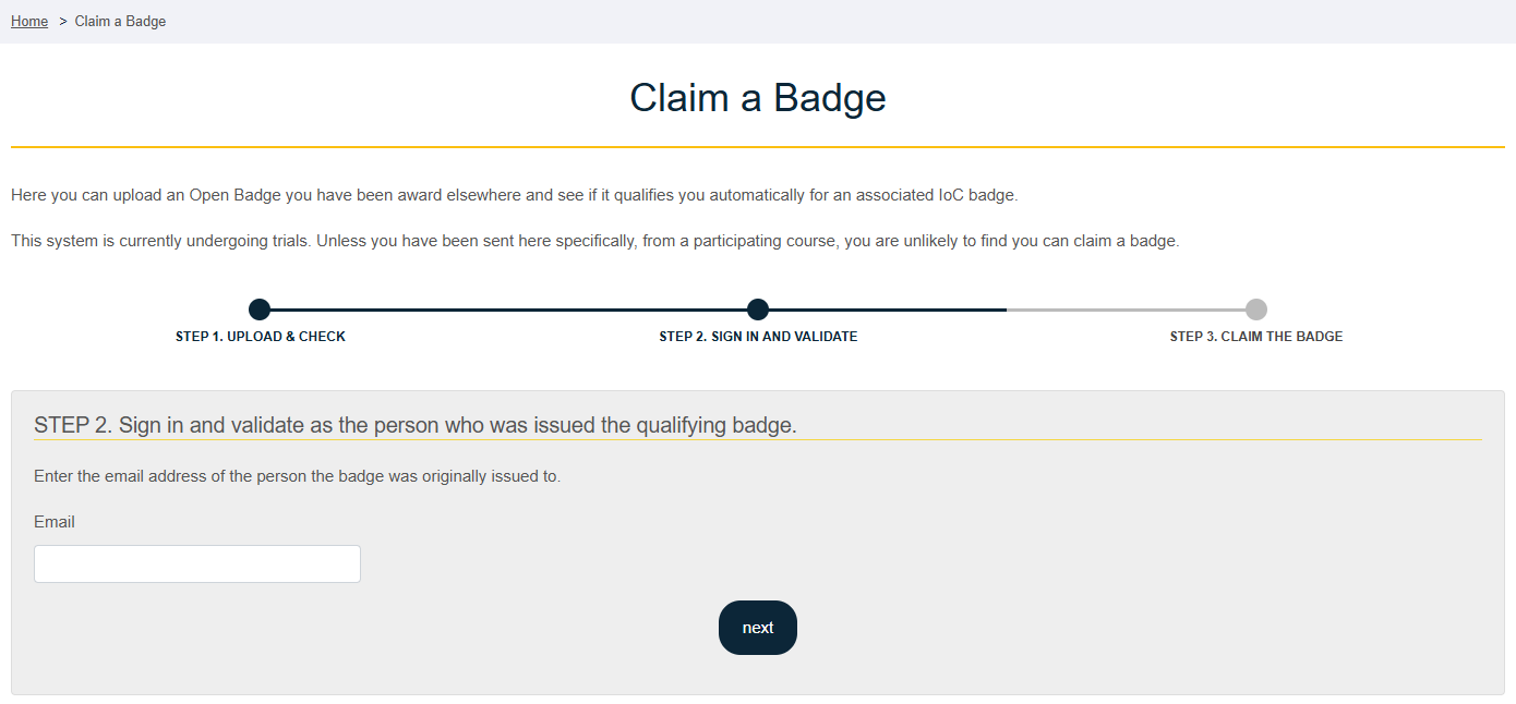 If the third-party Open Badge was deemed to have an associated IoC claimable badge on the platform, then the user would be asked to proceed and then enter the email address the third-party badge was issued to. That email address was then validated against the badge.